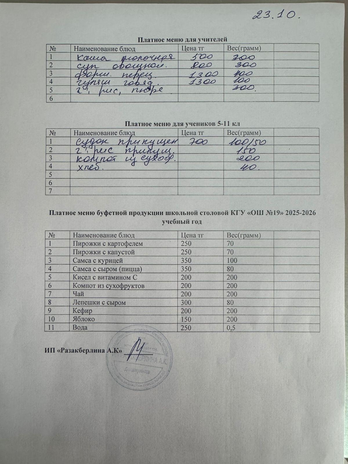 Күнделікті ақылы тамақтану мәзірі (23.10.2025)