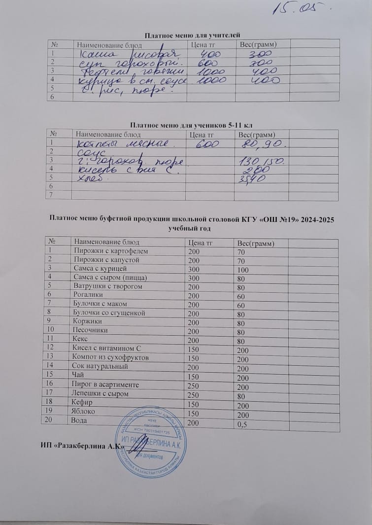 Күнделікті ақылы тамақтану мәзірі (15.05.2025)