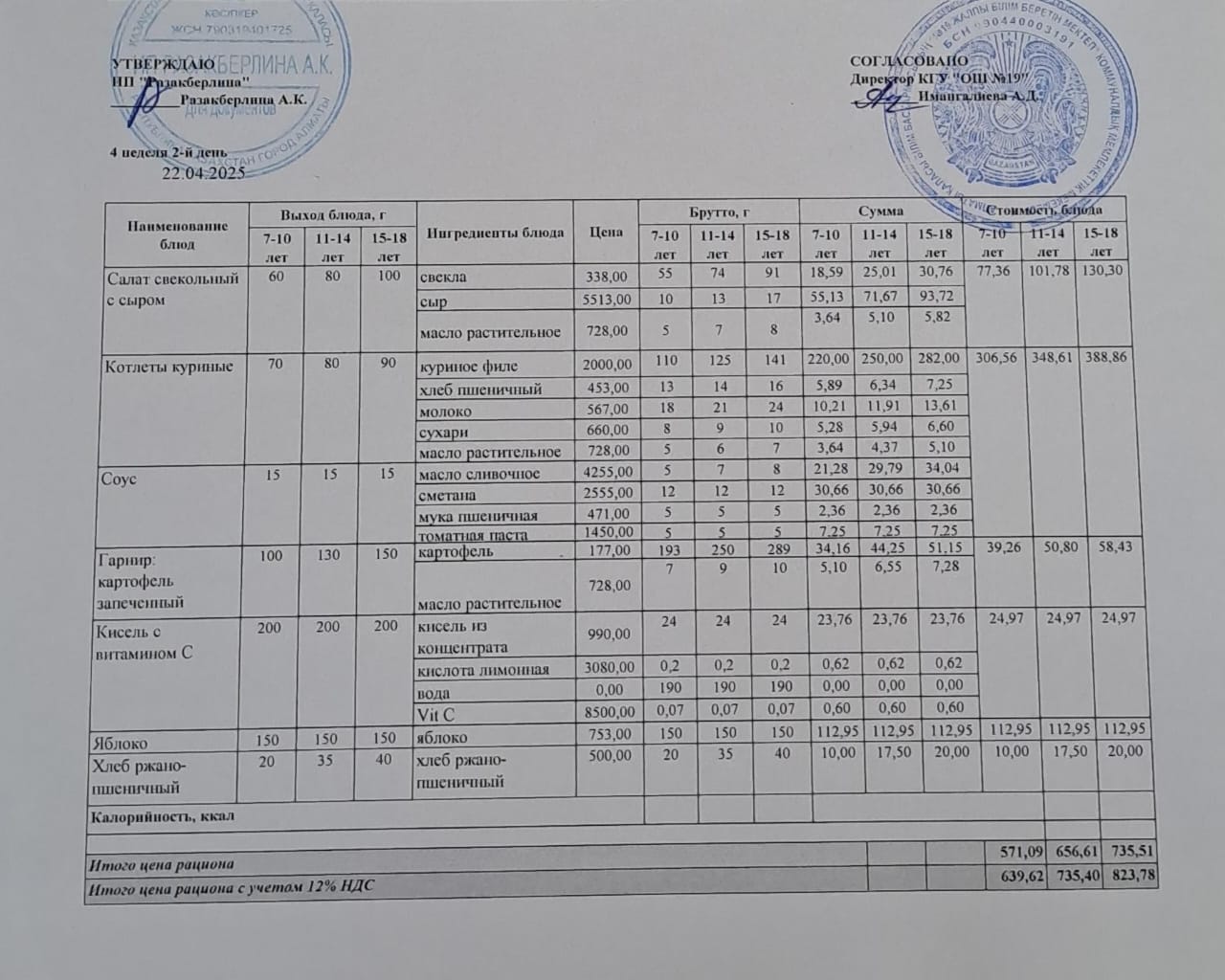 » Күнделікті ақылы тамақтану мәзірі (22.04.2025)