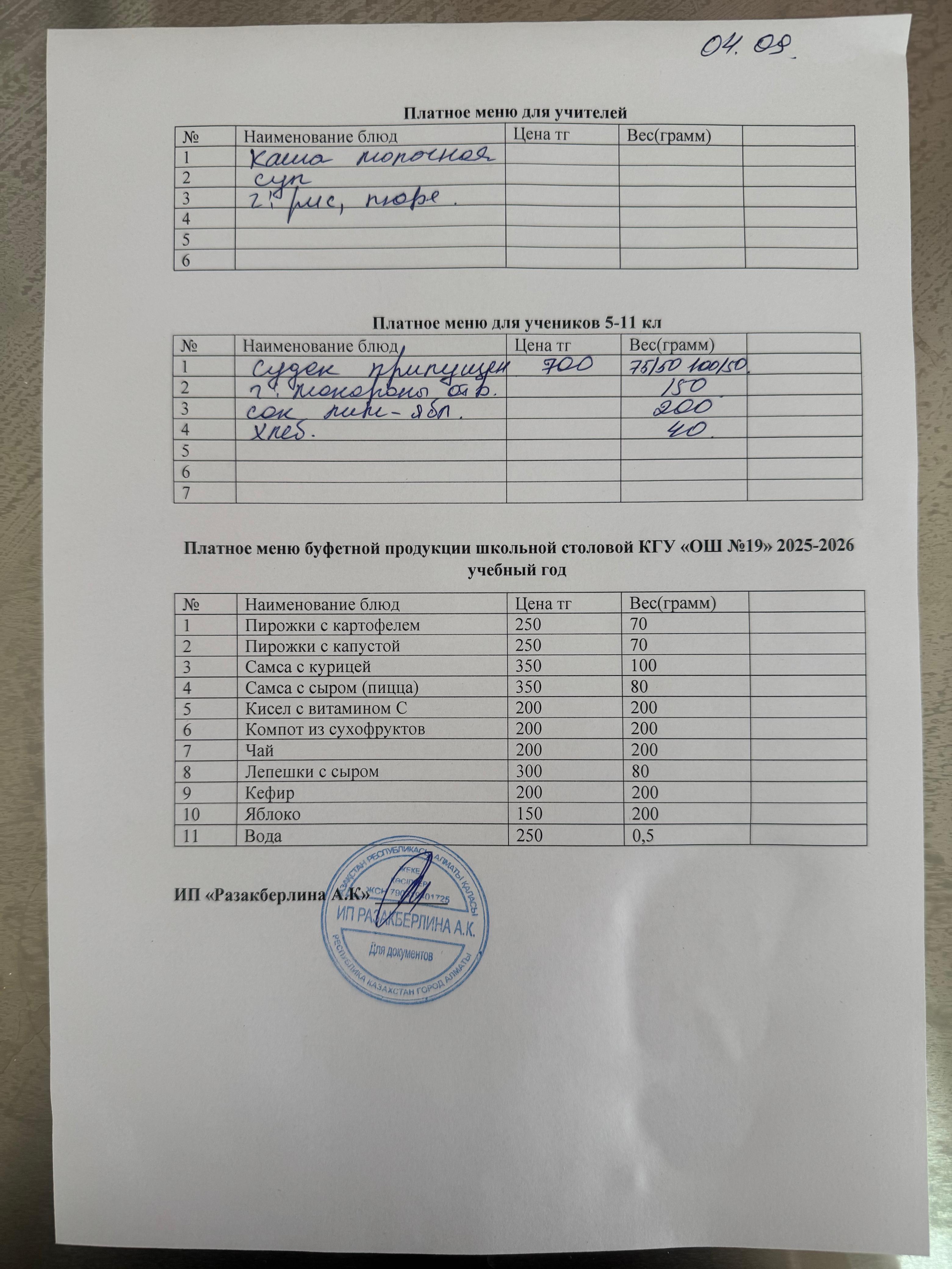 Күнделікті ақылы тамақтану мәзірі (04.09.2025)