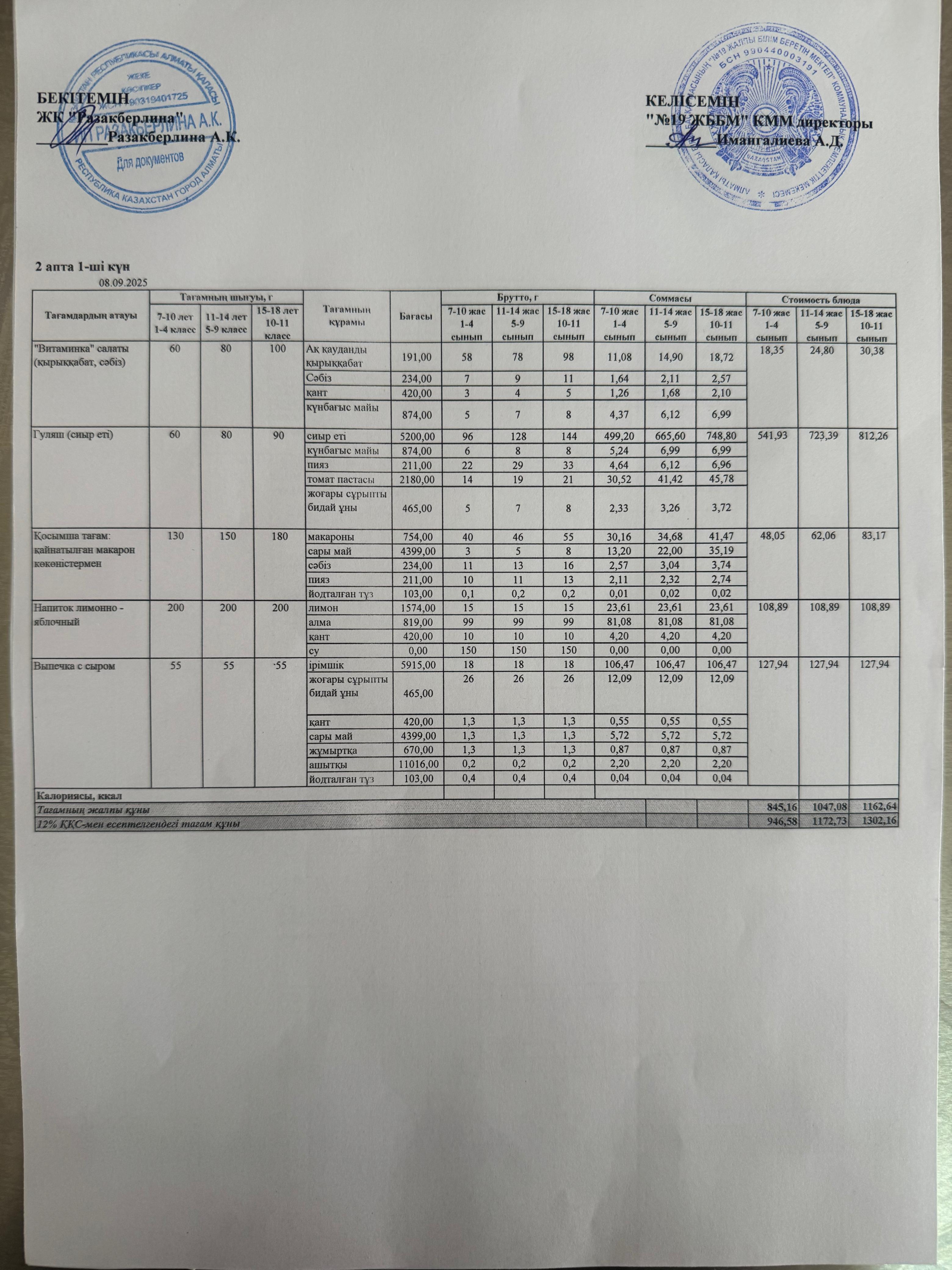 Күнделікті тегін тамақтану мәзірі (08.09.2025)