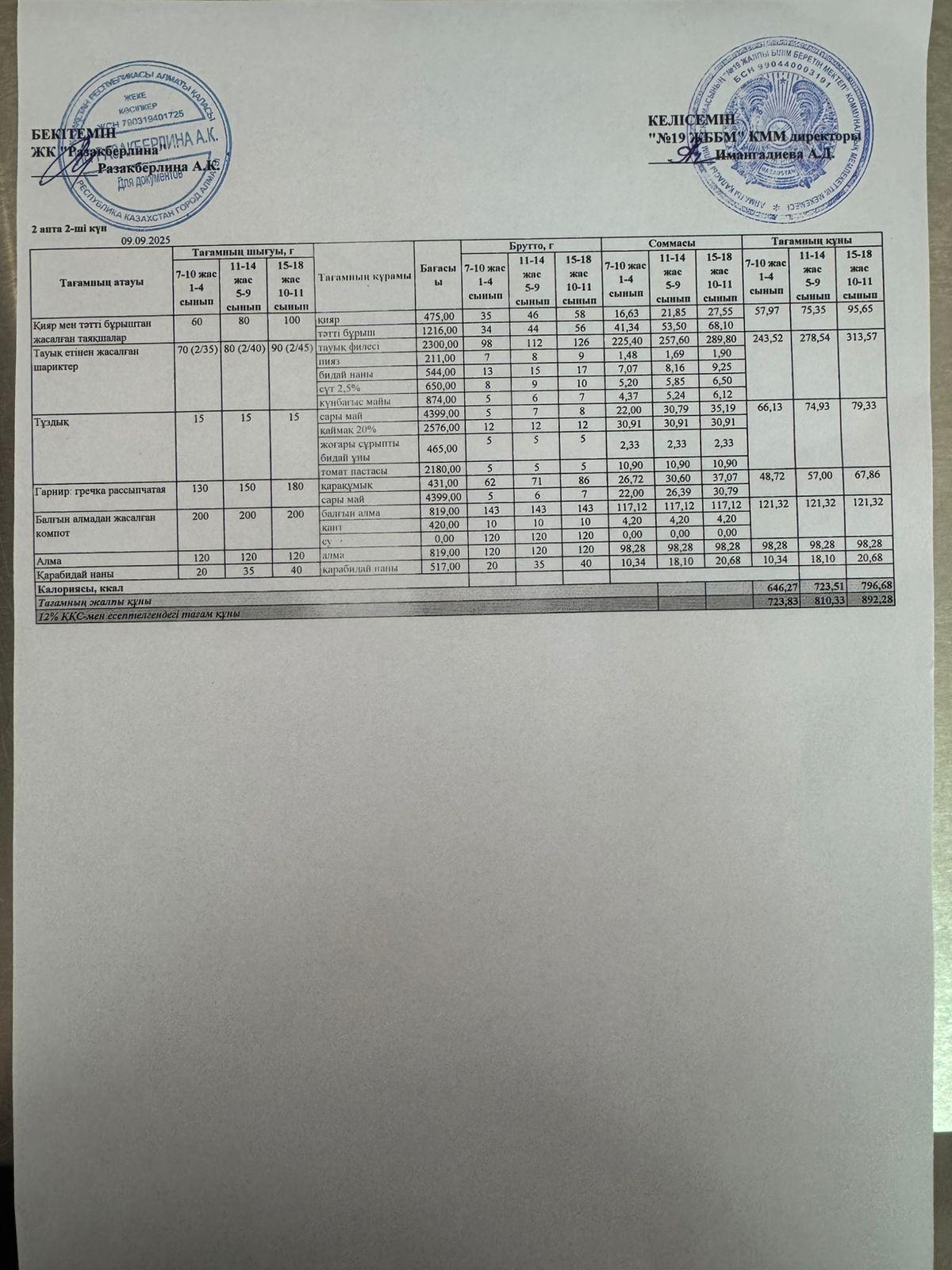 Күнделікті тегін тамақтану мәзірі (09.09.2025)