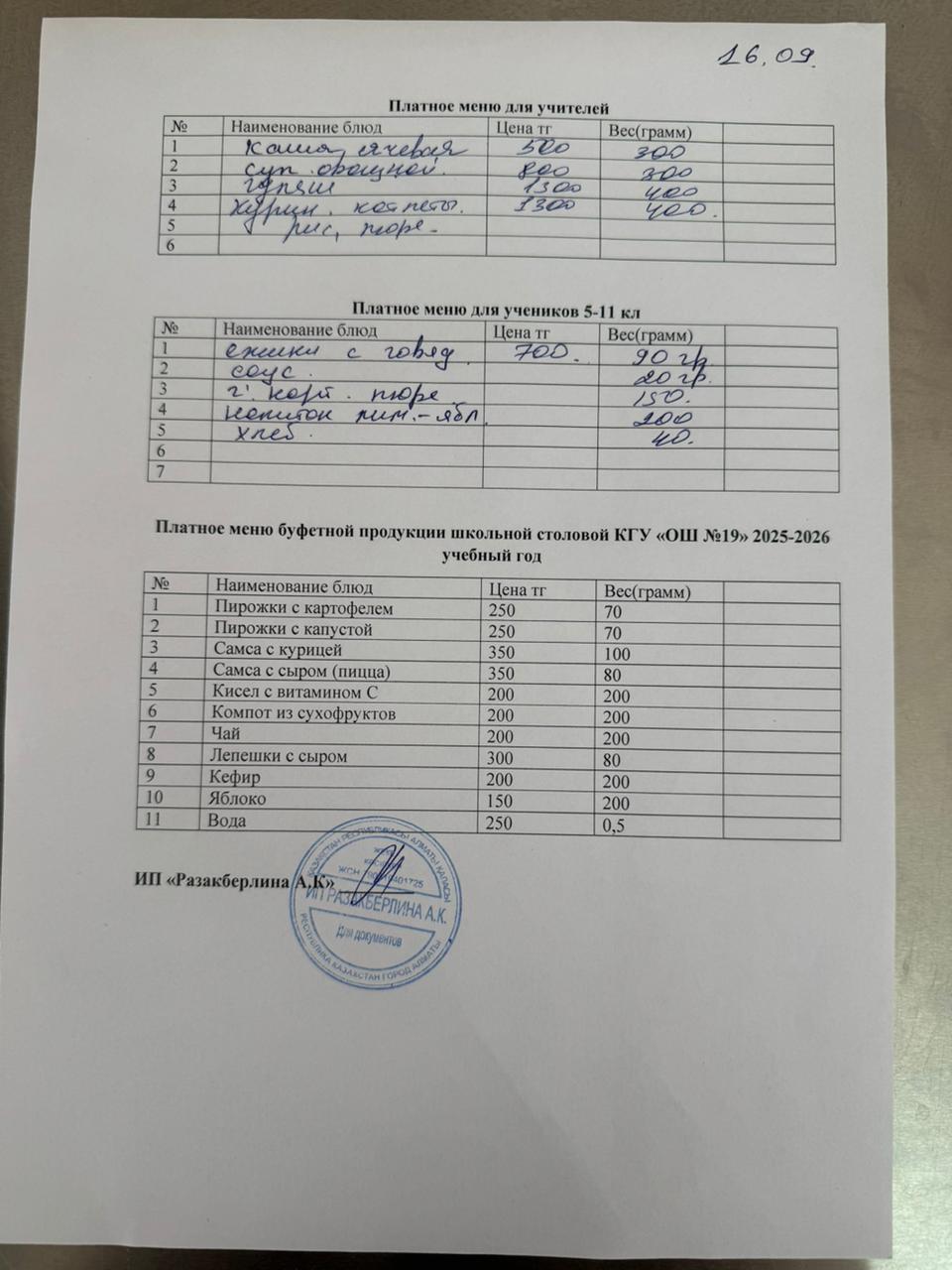 Күнделікті ақылы тамақтану мәзірі (16.09.2025)