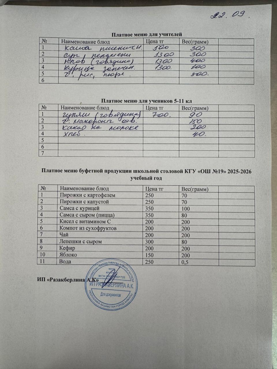 Күнделікті ақылы тамақтану мәзірі (22.09.2025)