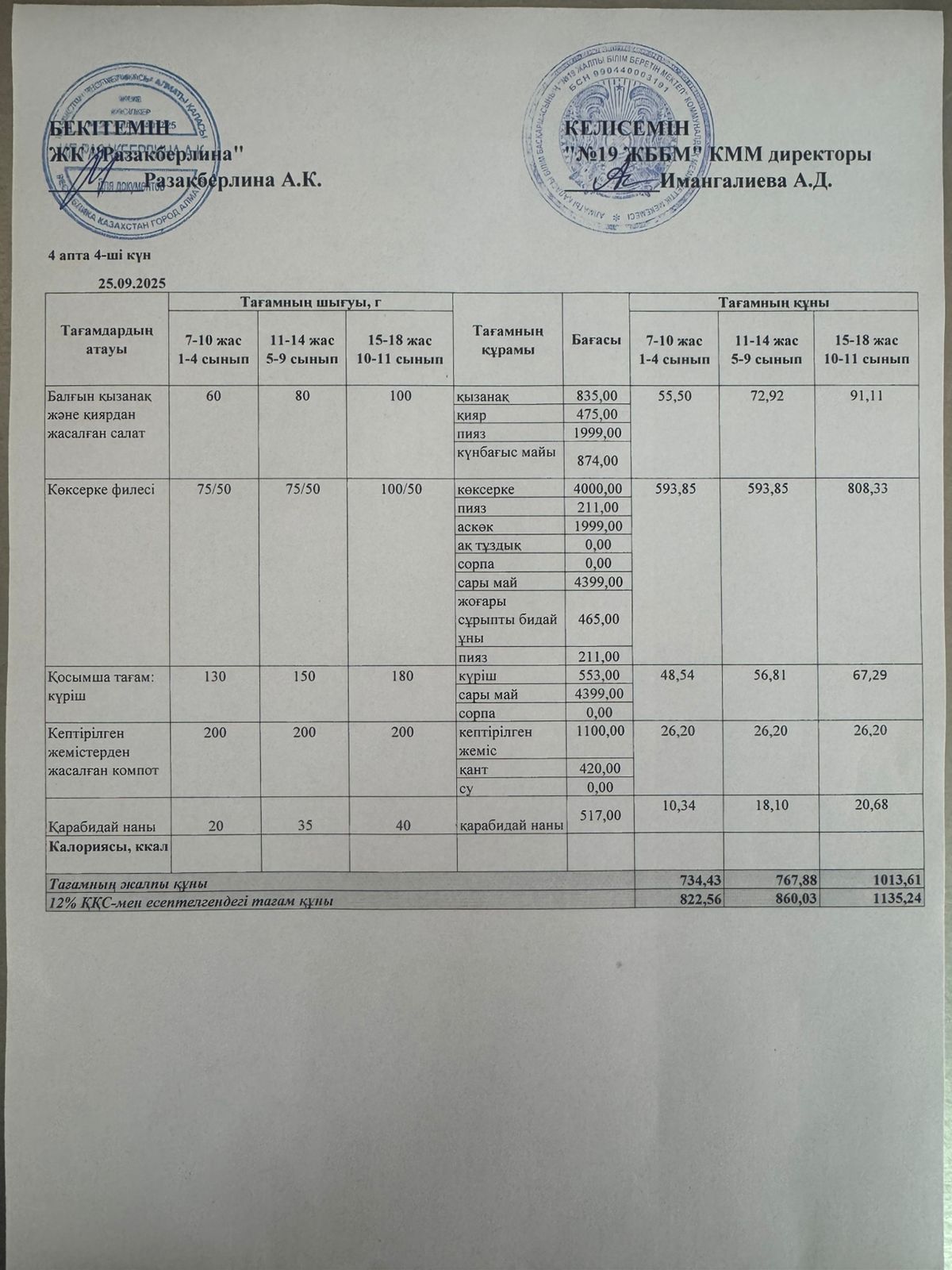 Күнделікті тегін тамақтану мәзірі (25.09.2025)