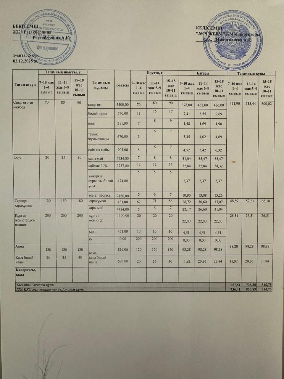 Күнделікті тегін тамақтану мәзірі (02.12.2025)