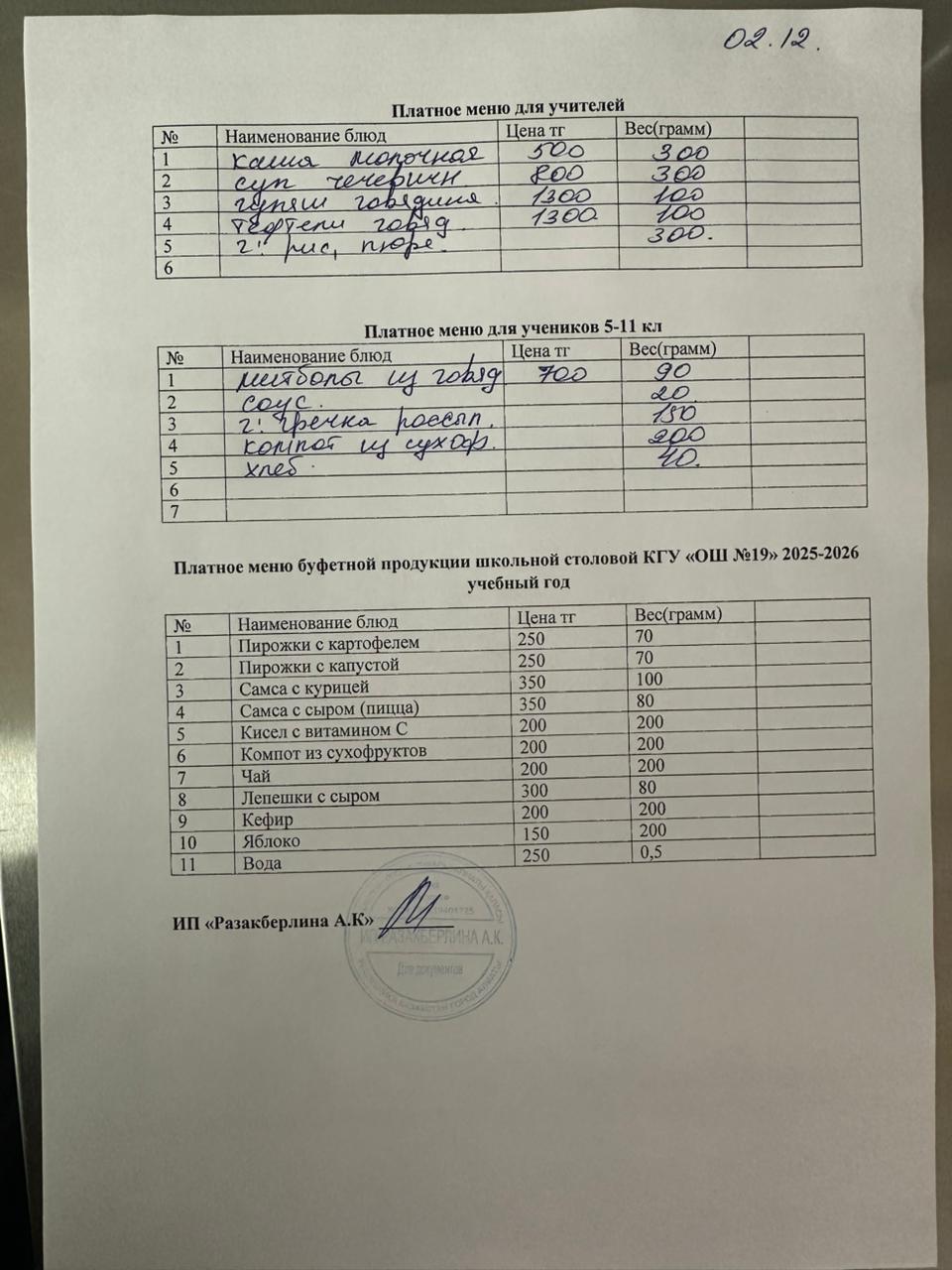 Күнделікті ақылы тамақтану мәзірі (02.12.2025)