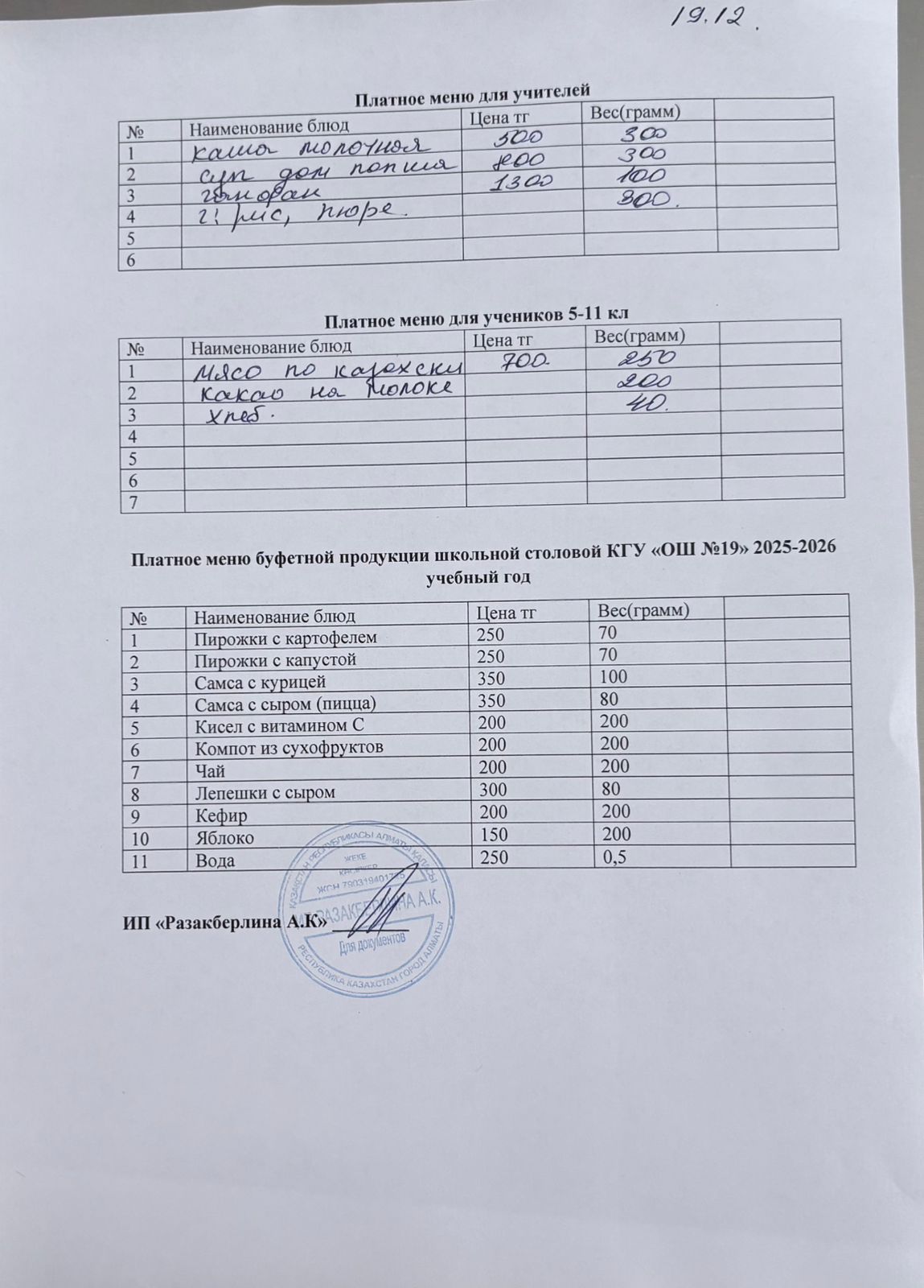 Күнделікті ақылы тамақтану мәзірі (19.11.2025)