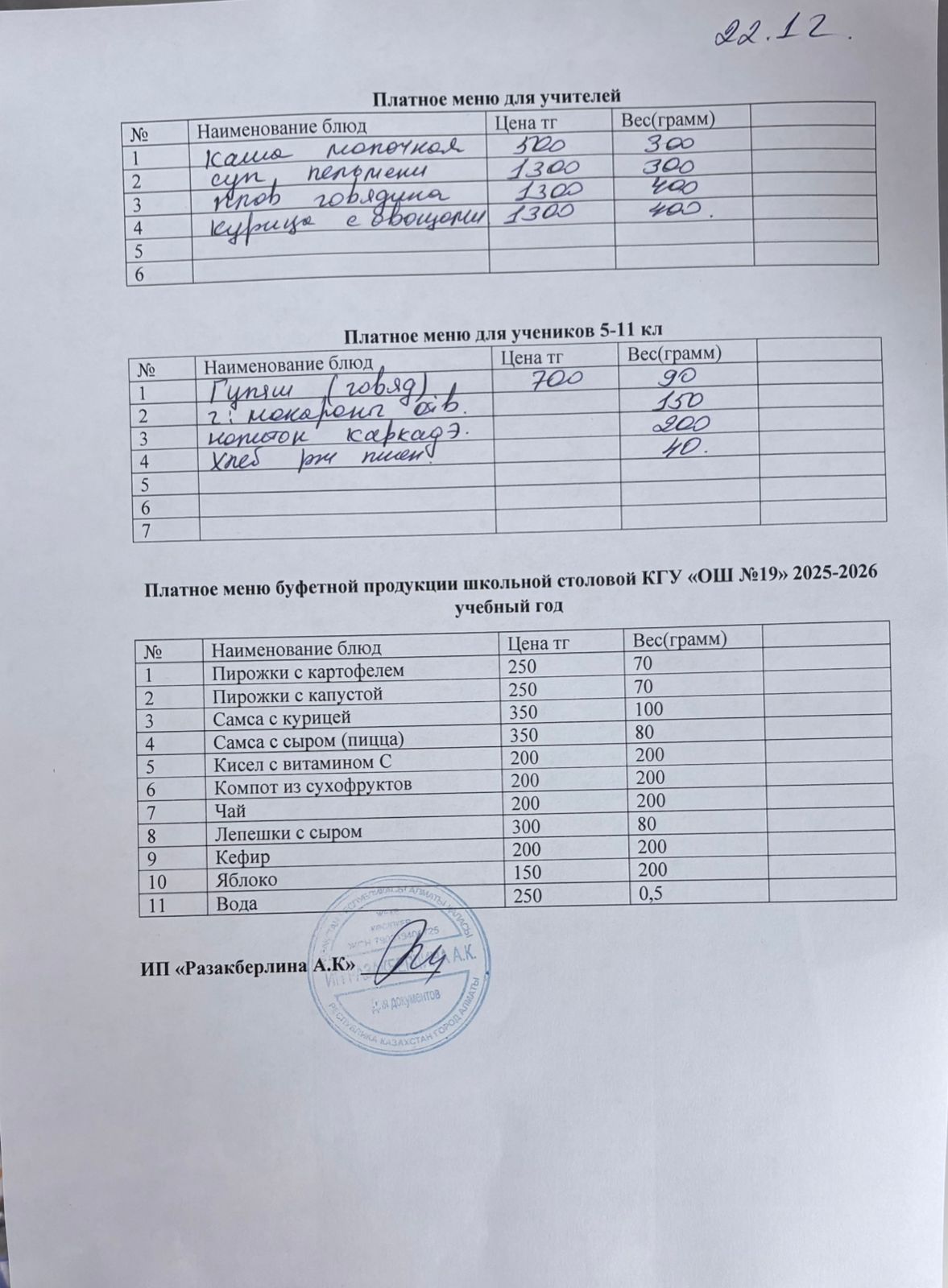 Күнделікті ақылы тамақтану мәзірі (22.12.2025)