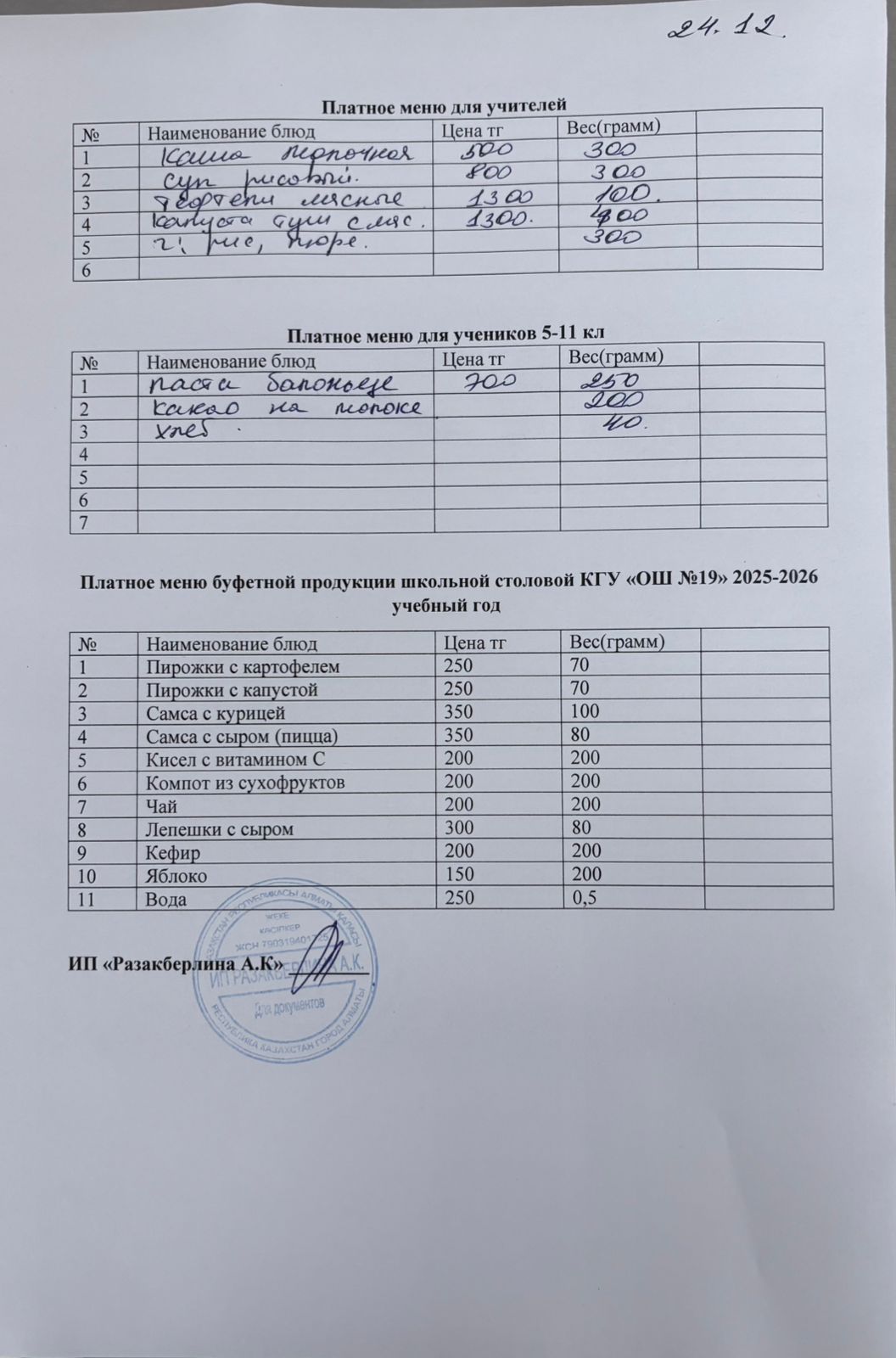 Күнделікті ақылы тамақтану мәзірі (24.12.2025)