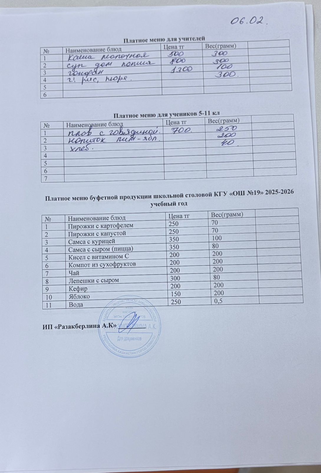 » Күнделікті ақылы тамақтану мәзірі (06.02.2026)
