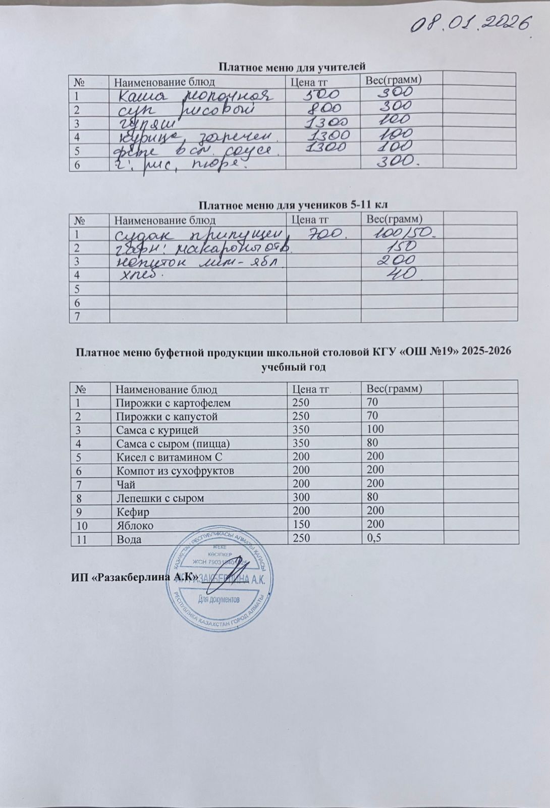 » Күнделікті ақылы тамақтану мәзірі (08.01.2026)