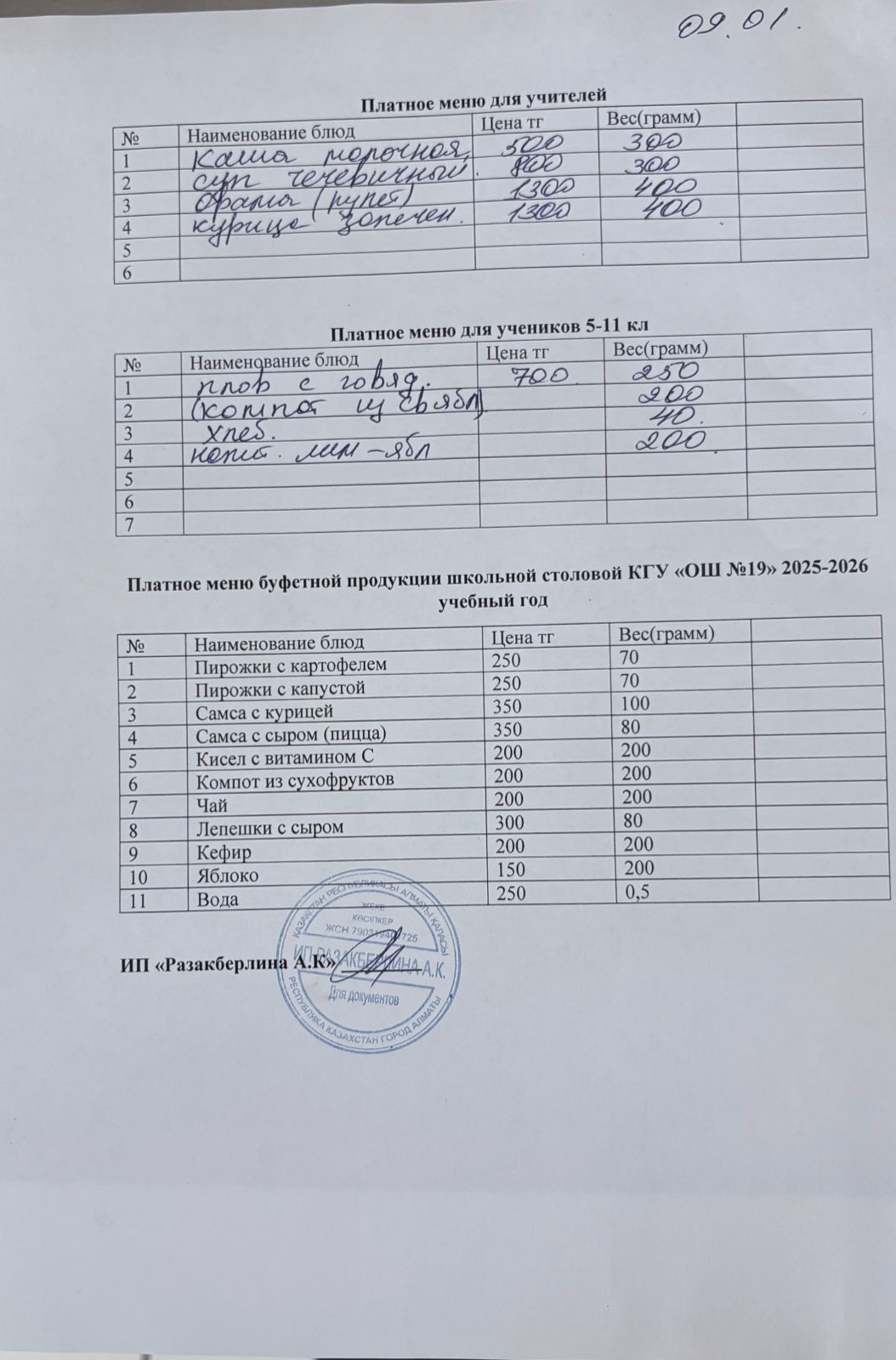Күнделікті ақылы тамақтану мәзірі (09.01.2026)