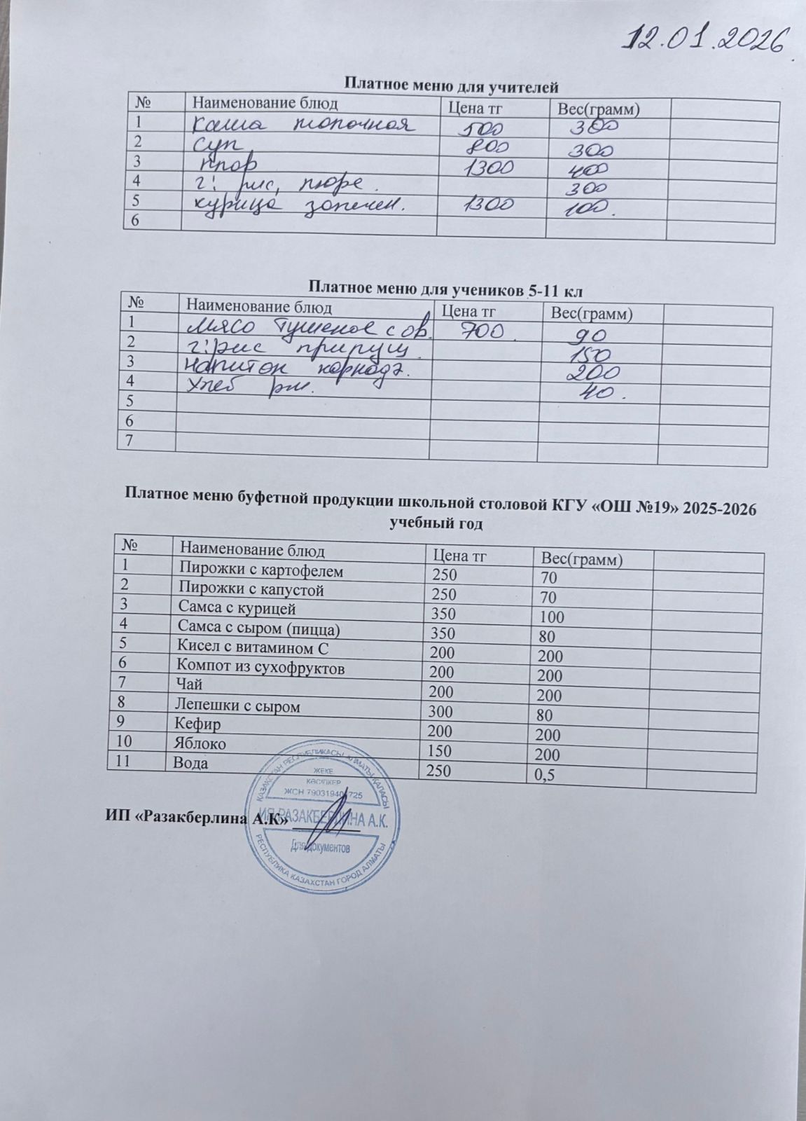Күнделікті ақылы тамақтану мәзірі (12.01.2026)