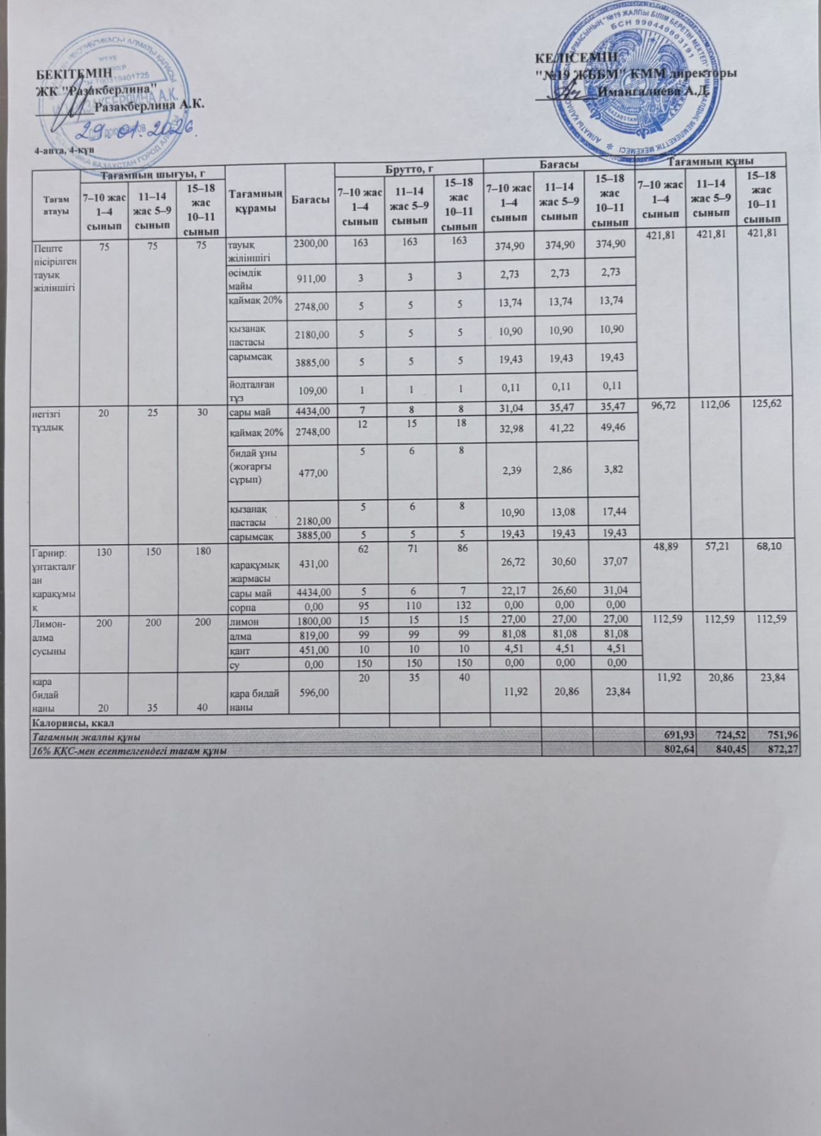 Күнделікті тегін тамақтану мәзірі (29.01.2026)